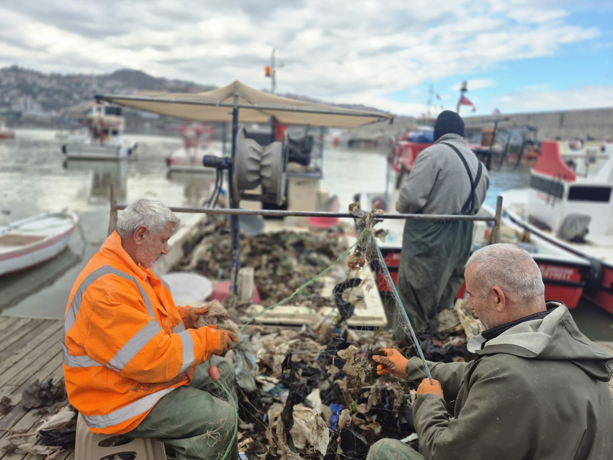 Zonguldak Limanı’ndan avlanmak için denize açılan balıkçılar, ağlarına takılan yaklaşık 1 ton çöp nedeniyle kıyıya erken döndü.
