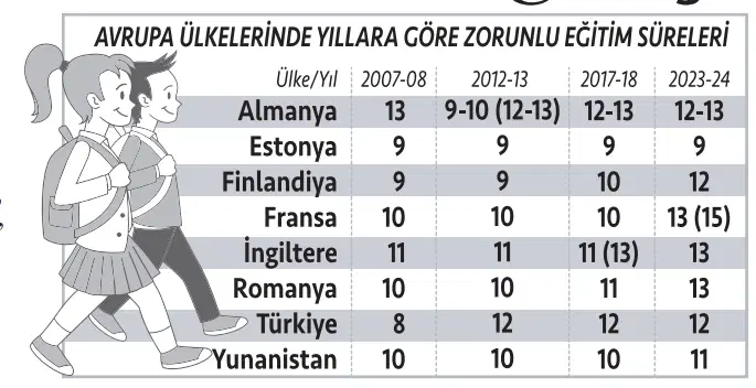 İngiltere’de de 11 yıllık zorunlu eğitim süresi 13 yıla çıkarılmış. Raporda, dünya genelinde eğitimin süresini kısaltma yönünde bir eğilim olmadığı, aksine ülkelerin zorunlu eğitimden ayrılma yaşını yükselterek okullaşmayı artırmayı, ne eğitimde ne istihdamda olan gençlerin oranını azaltmayı hedeflediği vurgulanıyor.